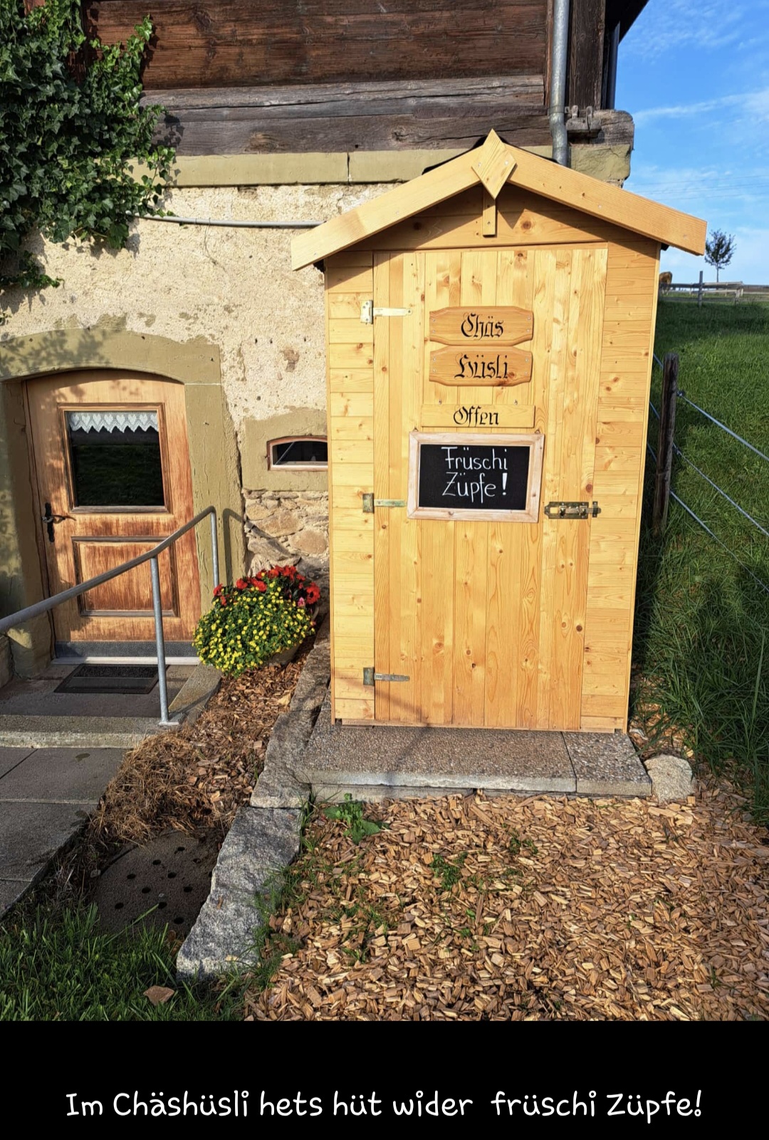 Im Chäshüsli verkaufen wir unseren Alpkäse, und Trockenwürste von den Alpschweinen. Jeweils am Dienstag und Donnerstag gibt es ab 9.00 Uhr frisches Bauernbrot und am Samstag frische Züpfe. Ebenfalls hat es Nidletäfeli und verschiedene selbstgemachte Güetzi im Chäshüsli. Das Chäshüsli ist jeden Tag offen. Selbstbedienung, bezahlen kann man Bar (es hat ein Kässeli) oder mit Twint.